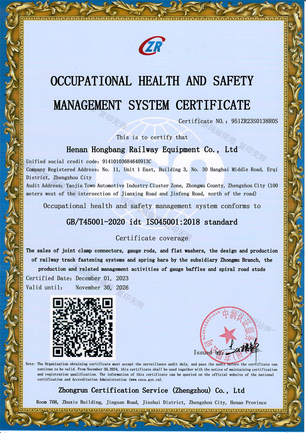 职业健康安全管理体系认证证书